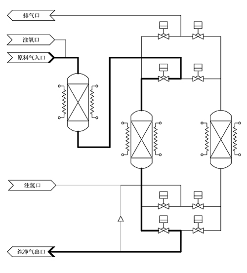 EGS9 nitrogen purifier operates with catalytic vessel connected in series to ADS vessel. The catalytic vessel works at high temperature without the need for regeneration and replacing, while multiple ADS connected in parallel alternate between ambient temperature purification and high-temperature modes. It has perfect alarm, interlocking and data recording functions, automatic operation.